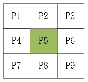 以3*3均值滤波器为例,均值滤波器算法原理如下图: