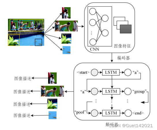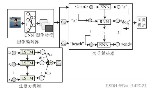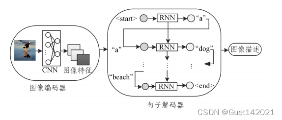 基于深度学习的图像描述生成方法大多采用以CNN-RNN为基本模型的编码器-解码器框架,CNN决定了整个模型的图像识别能力,其最后的隐藏层的输出被用作解码器的输入,RNN是用来读取编码后的图像并生成文本描述的网络模型,如图所示