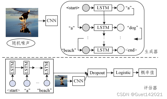 生成对抗网络模型中至少有两个模块:生成网络和判别网络.在训练过程中,生成网络生成尽量真实的数据以“欺骗”判别网络,并且通过判别网络的损失不断进行学习;而判别网络的任务就是区分生成的数据和真实数据.这两个网络通过动态的博弈学习,可以从无标签的数据中学习特征,从而生成新的数据.Dai等在2017年使用生成对抗网络通过控制随机噪声向量来生成多样化的描述.该模型分为两部分(如图所示):第一部分是句子生成部分,在该部分中依然使用CNN来提取图像特征,使用LSTM来生成句子,区别是在生成单词时加入了随机噪声,并在描述句生成完成后将其输入到第二部分的判别器进行评估.第二部分用来做句子评估,使用LSTM对句子进行编码,与图像特征一起处理获得一个概率值,评估该描述句是否与人类描述相似,是否符合图像内容,最后使用策略梯度方法反向传播更新参数,使其获得最大的概率值,直到输出理想的描述句。