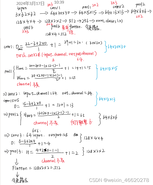 3, 32, 32(输入数据)-> 64, 30, 30(经过卷积层1)-> 64, 15, 15(经过池化层1)-> 64, 13, 13(经过卷积层2)-> 64, 6, 6(经过池化层2)-> 128, 4, 4(经过卷积层3) -> 128, 2, 2(经过池化层3)-> 512 -> 256 -> num_classes(10)