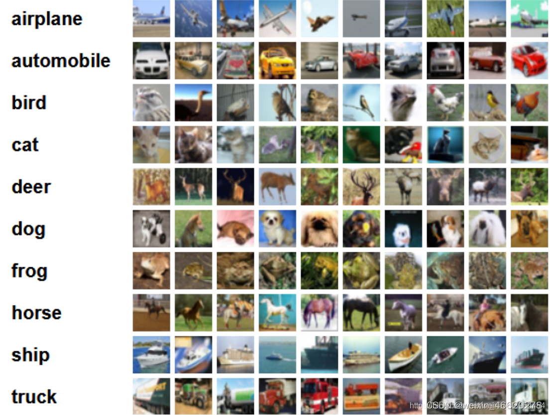 CIFAR10数据集是用来监督学习训练的,那么每个样本就一定都配备了一个标签值(用来区分这个样本是什么),不同类别的物体用不同的标签值,CIFAR10中有10类物体,标签值分别按照0~9来区分,他们分别是飞机( airplane )、汽车( automobile )、鸟( bird )、猫( cat )、鹿( deer )、狗( dog )、青蛙( frog )、马( horse )、船( ship )和卡车( truck )