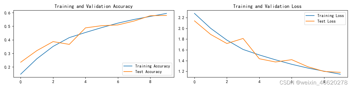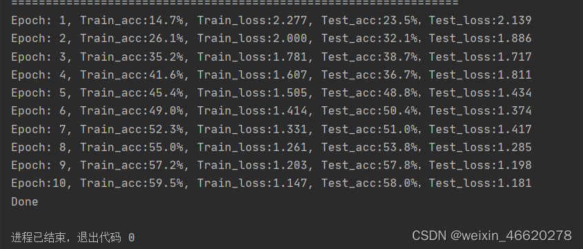 可以看出随着Epoch的增加,模型的精度咋不断提升,损失loss也在不断下降,但这里的epoch显然不够,因为最后精度最高也只达到了58%。