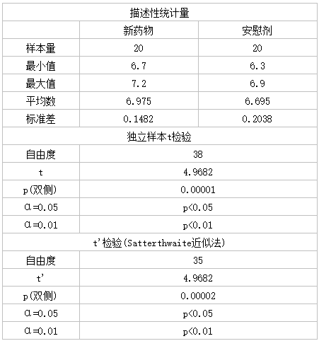 经计算:t=4.9682,p=0.00001,按α<0.05水准拒绝H0,接受H1,差异有统计学意义。可以认为新药物治疗和安慰剂治疗睡眠时间总体均数不同,新药物治疗效果好于安慰剂。