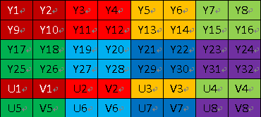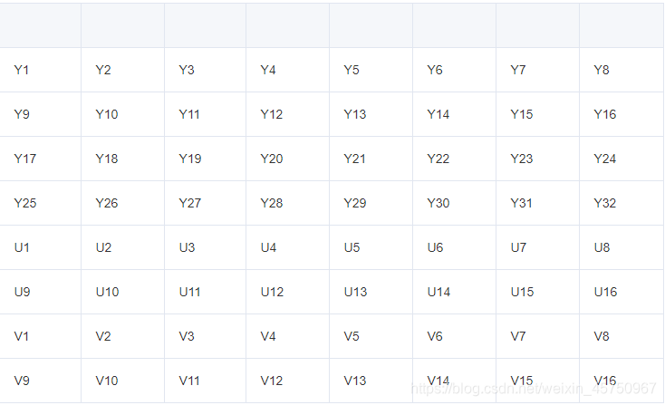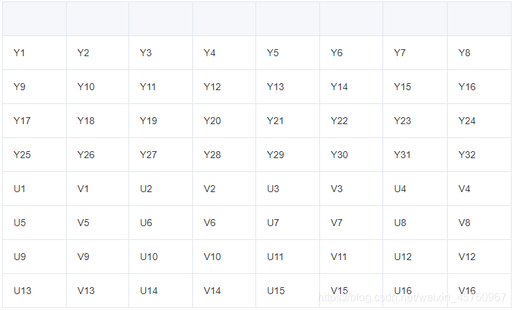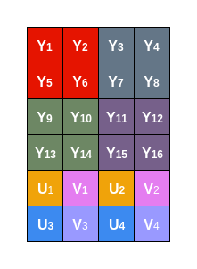 可以看到,第一行的Y1Y2和第二行的Y7Y8共同使用一组UV分量U1V1。