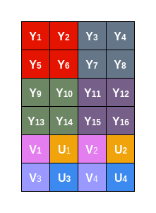 YUV 4:1:1 采样:每四个 Y 共用一组 UV 分量(4 个 Y 采样就对应 1 个 Cb 和 1 个 Cr 采样)。平均一个像素占用 8+2+2 = 12 位。