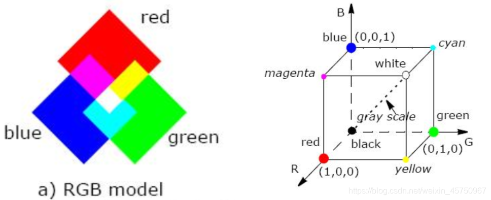 RGB 颜色空间可以看作是三维直角颜色坐标系中的一个正立方体。如上右图所示。红绿蓝三色在立方体的三个顶点上;洋红、青、黄色在立方体的立方体的另外三个顶点;黑色在坐标原点;而白色在离原点最远的定点上。在连接黑色与白色的对角线上,是亮度等量的三基色混合而成的灰色,该线称为灰色线。