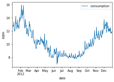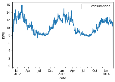 “LCLid”是标识每个家庭的唯一字符串,“Date”是不言自明的,“KWH”是该日期消耗的千瓦时总数,并且根本没有缺失值。由于我们想要以一般方式而不是每个家庭来预测消耗量,因此我们需要按日期对结果进行分组并平均千瓦时。