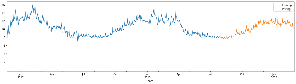 因此,“日期”功能目前是多余的。在删除它之前,我们将使用它将数据集拆分为训练集和测试集。与传统的训练相反,在时间序列中,我们不能只是以随机的方式分割集合,因为数据的顺序非常重要,而且我们只能合并以前的数据。否则,我们可能会被提示预测一个值,同时也考虑到未来的值!该数据集包含近 2.5 年的数据,因此对于测试集,我们将仅使用最近 6 个月的数据。如果训练集更大,我们会使用去年全年作为测试集。