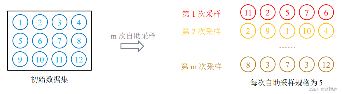 假设给定的数据集包含 n 个样本,接下来对该数据集进行有放回地抽样 m 次,这将产生含 m 个样本的训练集。由于采样时对每个样本都有放回,则用这样的方式得到的训练集很可能会包含一些重复样本(即某些样本在该训练集中出现多次)。