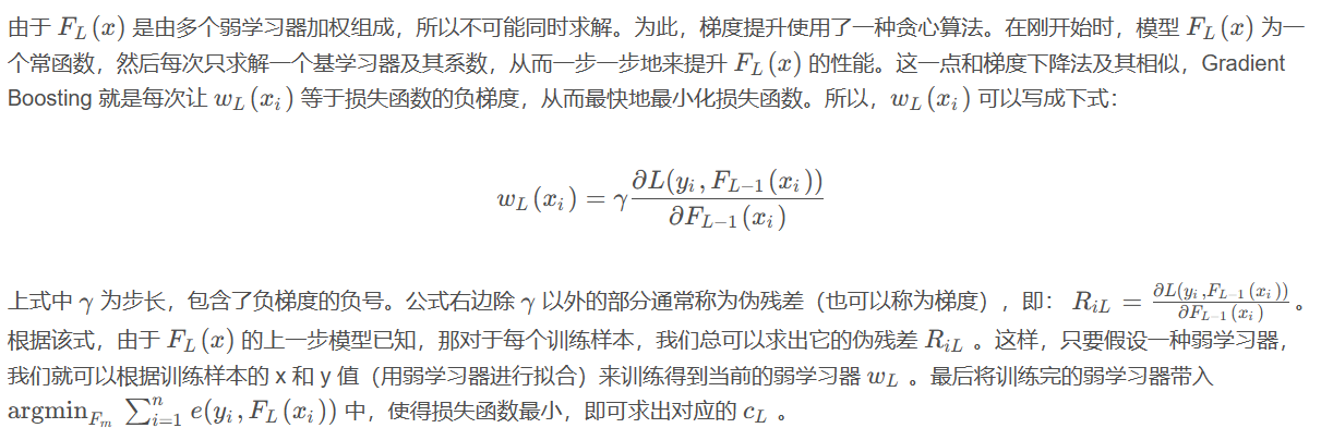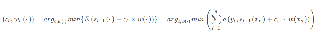其中,E(⋅) 是给定模型的拟合误差,e(⋅) 是损失(误差)函数。因此,我们并没有在求和过程中对全部(L个)模型进行全局优化,而是通过局部优化来将近似最优系数以及弱学习器逐个添加到强模型中。