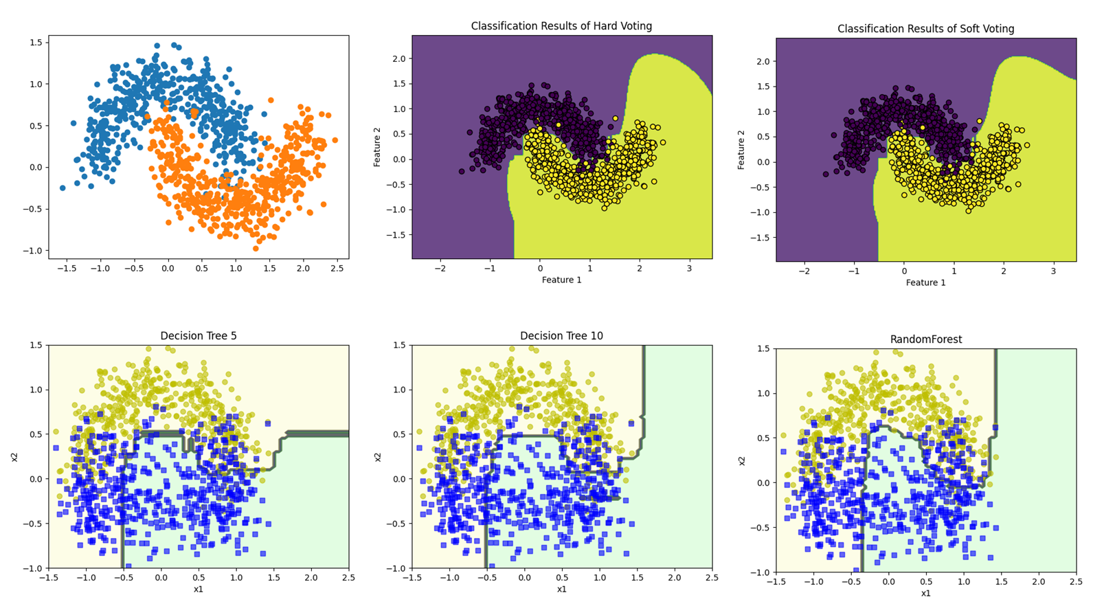 可见,软投票取得的效果相较于硬投票更好;且随着bagging中决策树个体学习器数量的增加,得到的效果也更好;但是并不是说数量越大越好,若设置的过大可能会导致过拟合,得不偿失。