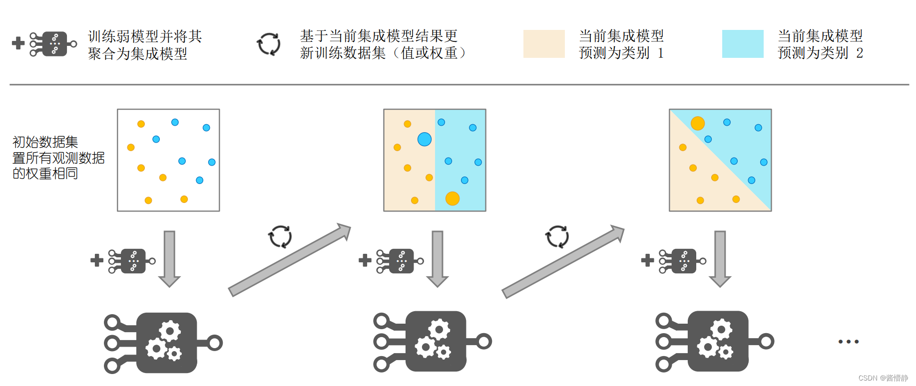 串行生成(Sequential Generation):在某些集成学习方法中,个体学习器之间存在强依赖关系,需要按照一定的顺序进行生成。这意味着每个个体学习器的生成依赖于前一个个体学习器的结果。典型的串行生成方法包括Boosting算法中的AdaBoost和Gradient Boosting等。在这些方法中,每个个体学习器的生成都依赖于前一个个体学习器的性能和权重调整。通过迭代训练和样本权重调整,每个个体学习器逐步提高对困难样本的拟合能力,从而形成一个强大的集成模型。