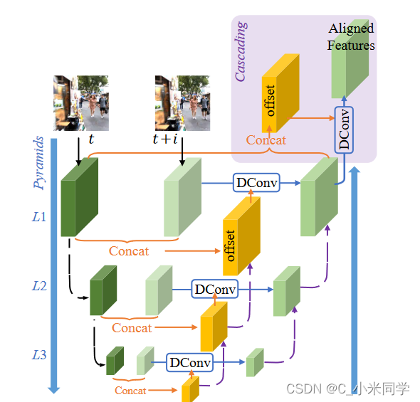 首先,为了处理大型运动,我们设计了一个金字塔、级联和可变形(PCD)对齐模块,在该模块中,帧对齐在特征级使用可变形卷积以从粗到细(coarse-to-fine)的方式完成。