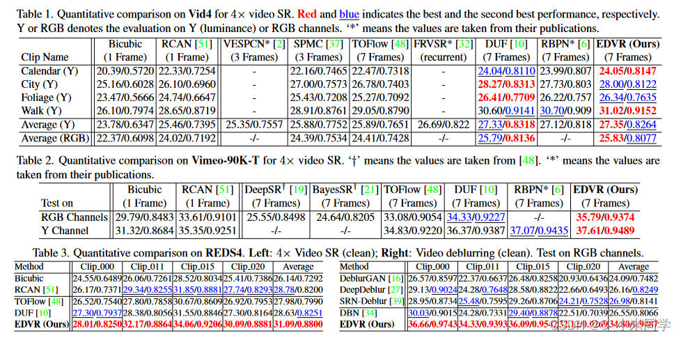 多亏了这些模块,我们的EDVR在NTIRE19挑战赛中视频恢复和增强挑战的所有四个轨道中都获得了冠军,并以较大的优势超过了第二名。EDVR在视频超分辨率和去模糊方面的性能也优于最新发布的方法。