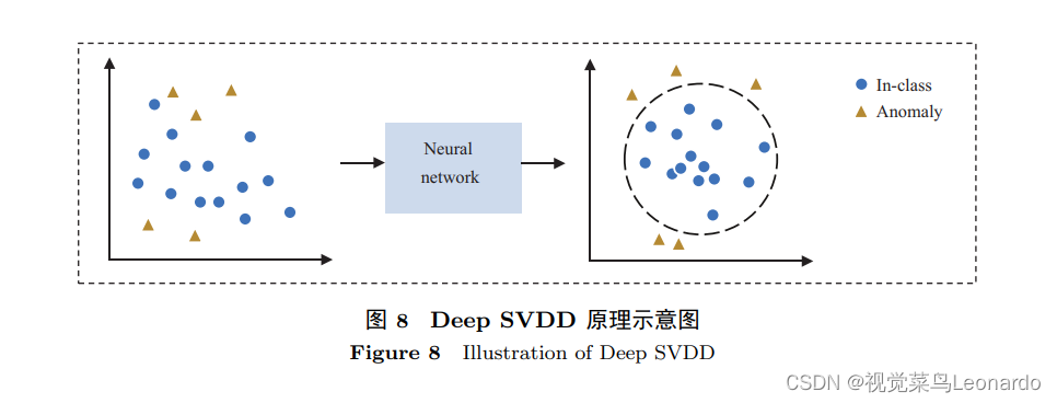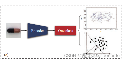 训练时通过神经网络提取正常图像的特征,并让提取出的正常图像的特征向量尽可能的分布紧凑,测试时模型提取待测样本的特征并映射到上述特征空间,根据分类洁面判断测试样本是否异常。