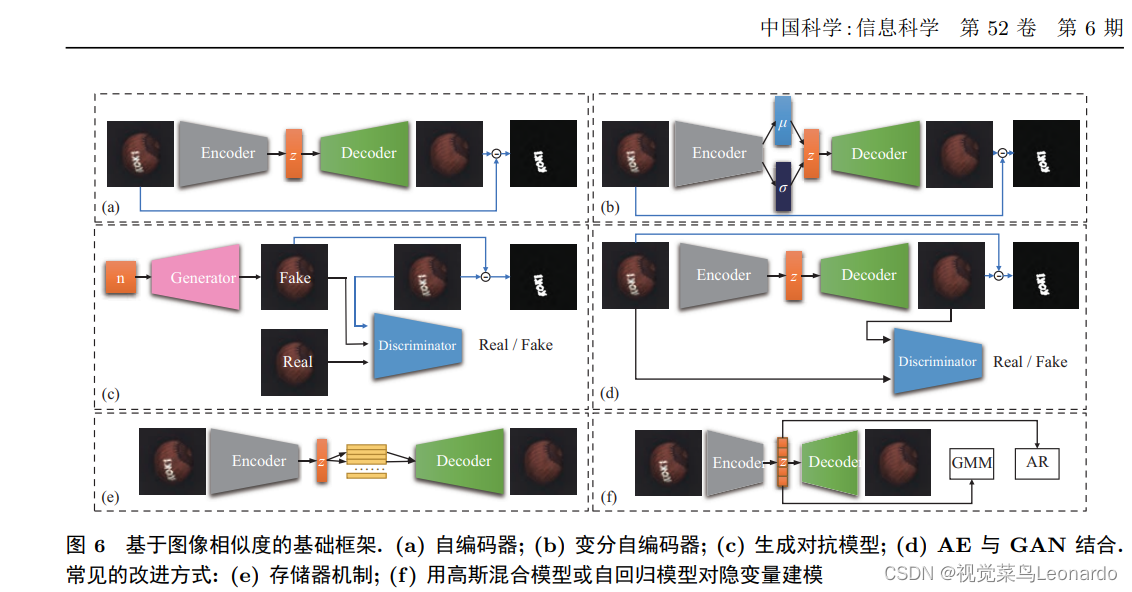 AE或VAE与GAN结合逐渐流行,推理阶段根据生成图像和输入图像的重构误差以及两者的编码误差来进行缺陷检测。