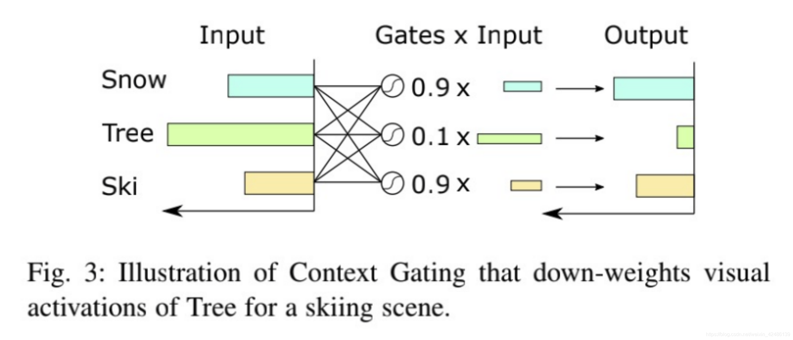 context gating论文中(Learnable pooling with context gating for video classification)举的例子比较贴切,比如滑雪场景,有树、雪、滑雪,树对判定为滑雪的贡献不大,CG可以抑制树的视觉激活。
