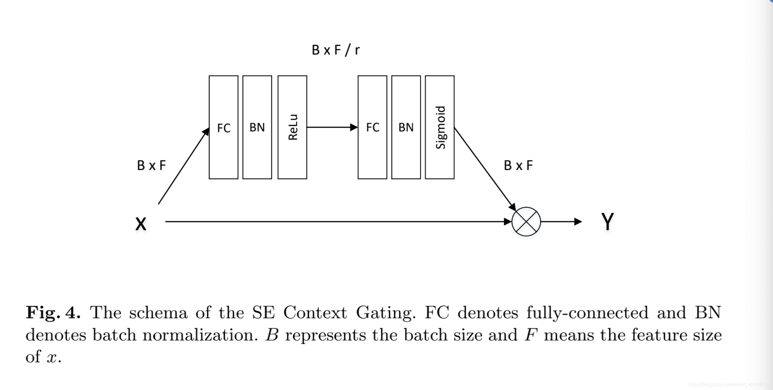 全连接输出的特征后接一层SE context gating,结构类似SE。SE context gating的输入即一维向量,免去了SE结构中的global average pooling。 SE CG得到一维方向上的权重,加权到原来的输出上,对输出特征做进一步校准。SE Context Gating代替netvlad中的Context Gating,进一步降低了参数量。