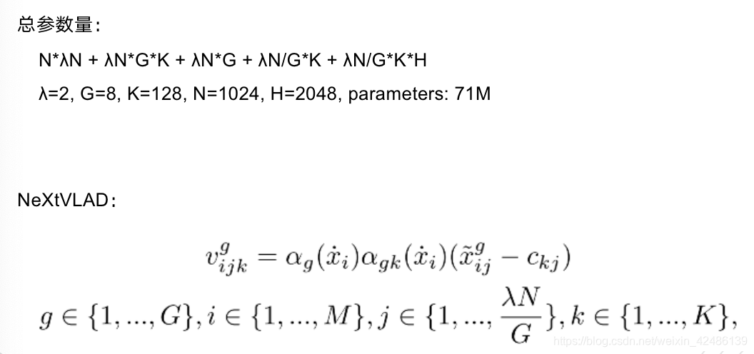 但是resnext相较于resnet并没有降低参数量,只是增加了更多的非线性,提高精度。nextvlad是如何做到降低参数量的?如下图,虚线框内是分组再聚合的过程,这个过程参数量并没有降低,真正对降低参数量做贡献的是框外的全连接层,由于分组,全连接的输入参数变为netvlad的倍(论文中