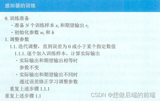 需要人为确定参数不同,感知器能够通过训练自动确定参数。训练方式为有监督学习,即需要设定训练样本和期望输出,然后调整实际输出和期望输出之差的方式(误差修正学习)。误差修正学习可用公式(3.1)和(3.2)表示。