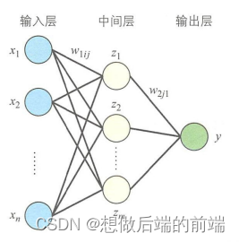 下面再来看一下包含中间层的多层感知器。首先是只有一个输出单元y的多层感知器,如图所示。 表示输入层与中间层之间的连接权重,