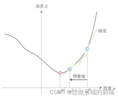 接着再来看一下权重调整值。根据上述说明,权重需要进行调整以使最小二乘误差函数趋近于0。对误差函数求导就能得到上图中给定点的梯度,即可在误差大时增大调整值,误差小时减小调整值,所以连接权重调整值 可以用公式(5.1)表示。