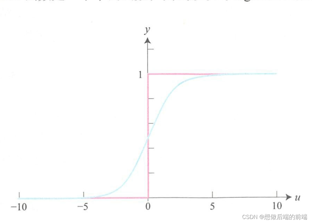 如下图蓝线所示,使用 sigmoid 函数时,如果对输入数据进行 加权求和得到的结果 u 较大则输 1,较小则输出 0。 而 M-P 模型中使 用的是 step 两数(如图中的红线所示),当 u 等于 0 时,输出结果 在 0和1 之间发生刷烈变动 。 另外, sigmoid 函数的曲线变化则较平缓 。