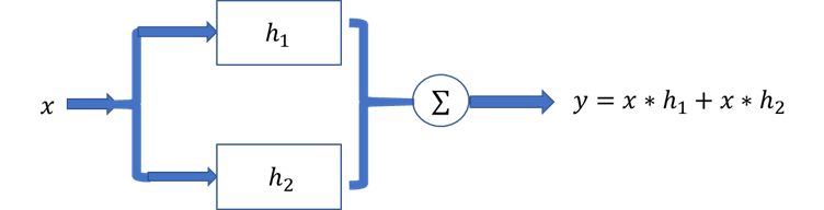 由分配律可知: y = x ∗ h 1 + x ∗ h 2 = x ∗ ( h 1 + h 2 ) y = x*h_1 +x*h_2 = x*(h_1+h_2) y=x∗h1+x∗h2=x∗(h1+h2),因此原系统又可以改成: