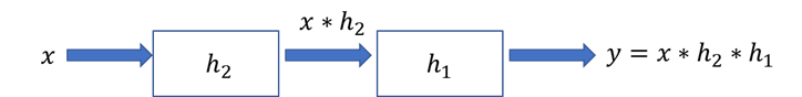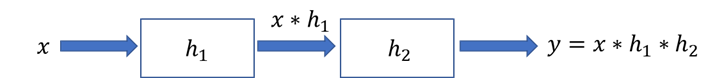 由交换律可知: y = x ∗ h 2 ∗ h 1 y = x*h_2*h_1 y=x∗h2∗h1,也就是说原系统也可以写成脉冲响应为 h 2 h_2 h2 的系统和脉冲响应为 h 1 h_1 h1 的系统级联,如下图: