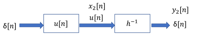 我们现在考虑上图中脉冲响应为 h − 1 h^{-1} h−1 的系统,我们知道: x 2 [ n ] ∗ h − 1 = y 2 [ n ] x_2[n]*h^{-1} = y_2[n] x2[n]∗h−1=y2[n]