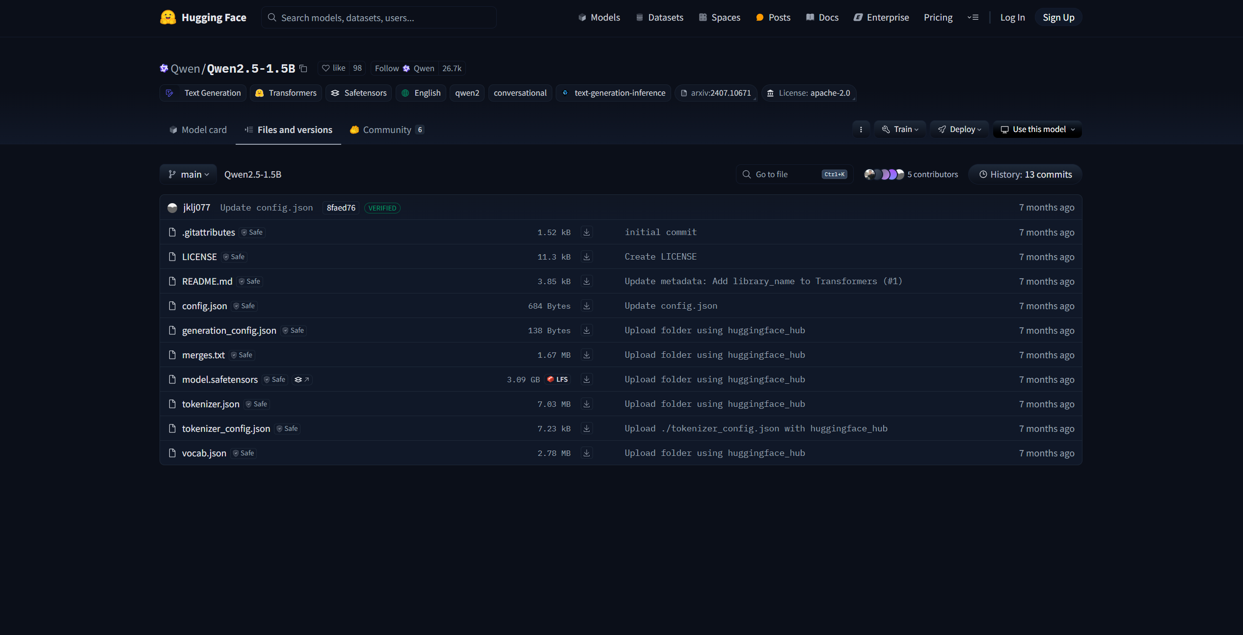 该界面即为 HuggingFace 社区中的 Qwen-2.5-1.5B 模型参数,其中的 `config.json` 文件即是模型的配置信息,包括了模型的架构、隐藏层大小、模型层数等