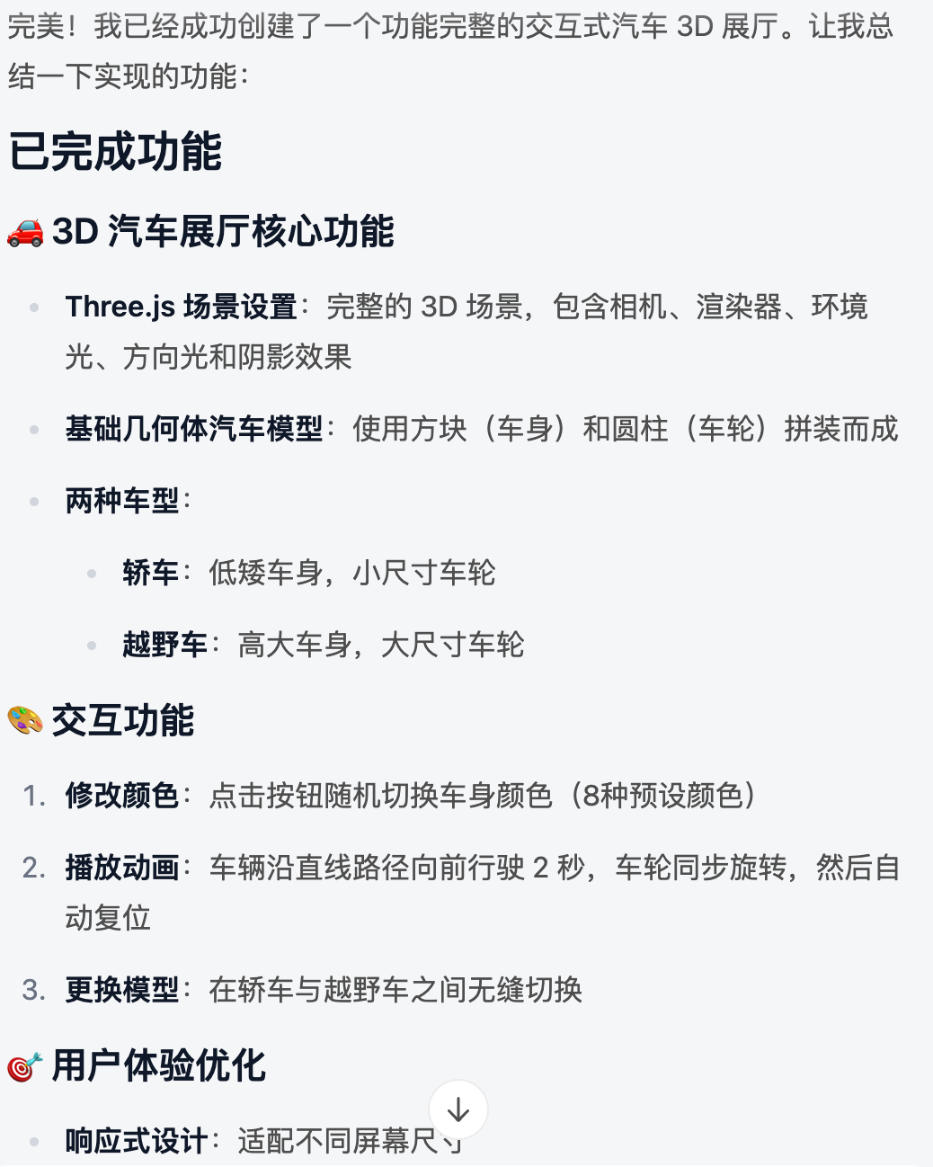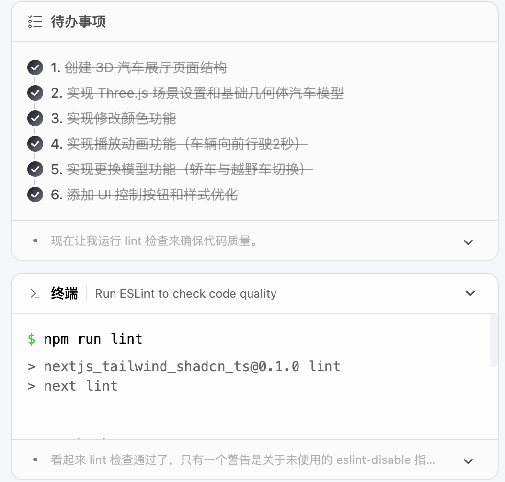 "我将帮您创建一个使用 Three.js 的交互式汽车 3D 展厅。首先让我查看当前项目结构,然后开始开发...."