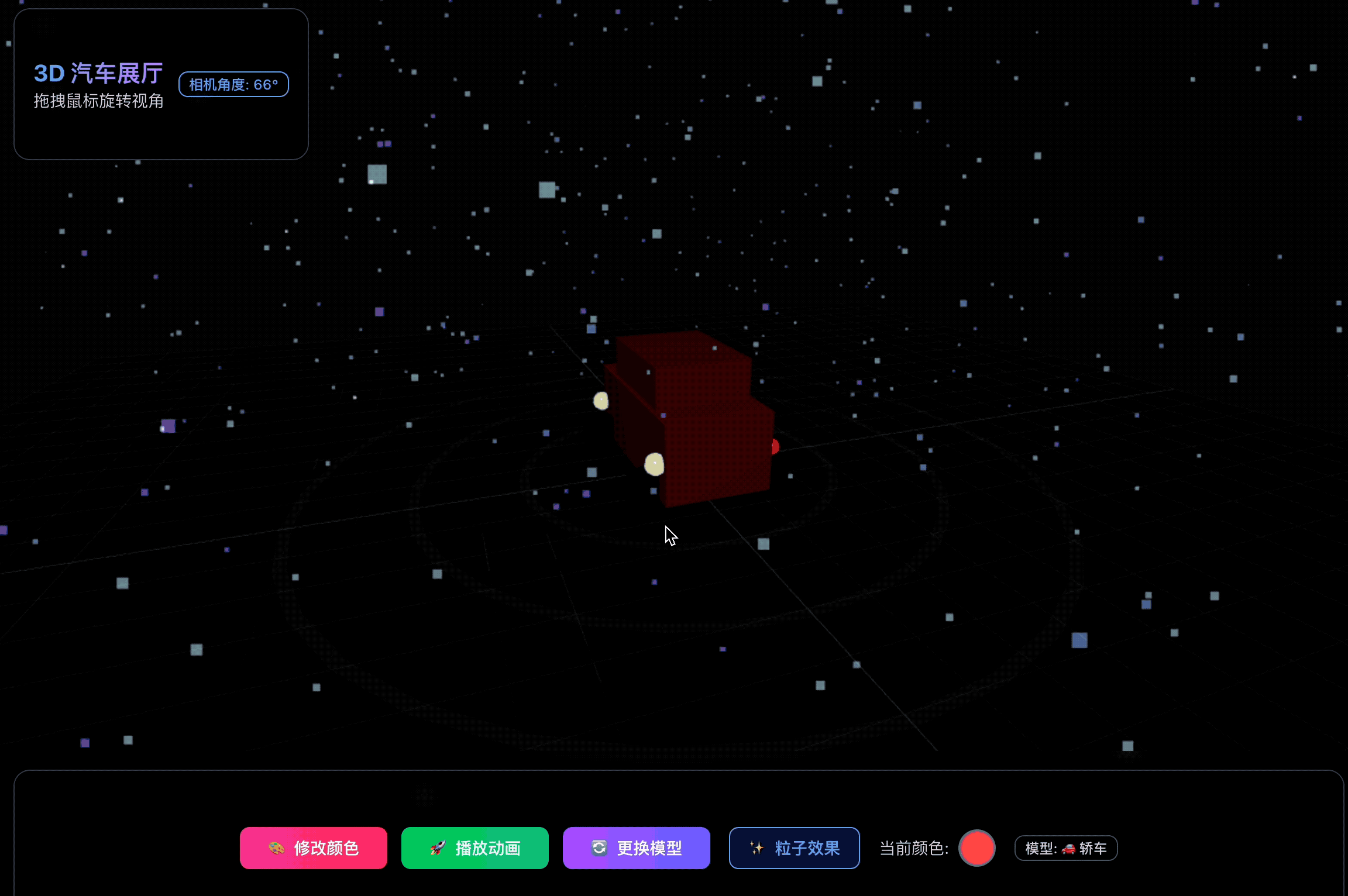 "优化这个项目,我想让汽车看起来更酷炫,可以加一些粒子效果什么的,然后UI也做的好看一些。场景也美观一些。鼠标可以点击旋转视角来进行观察。"