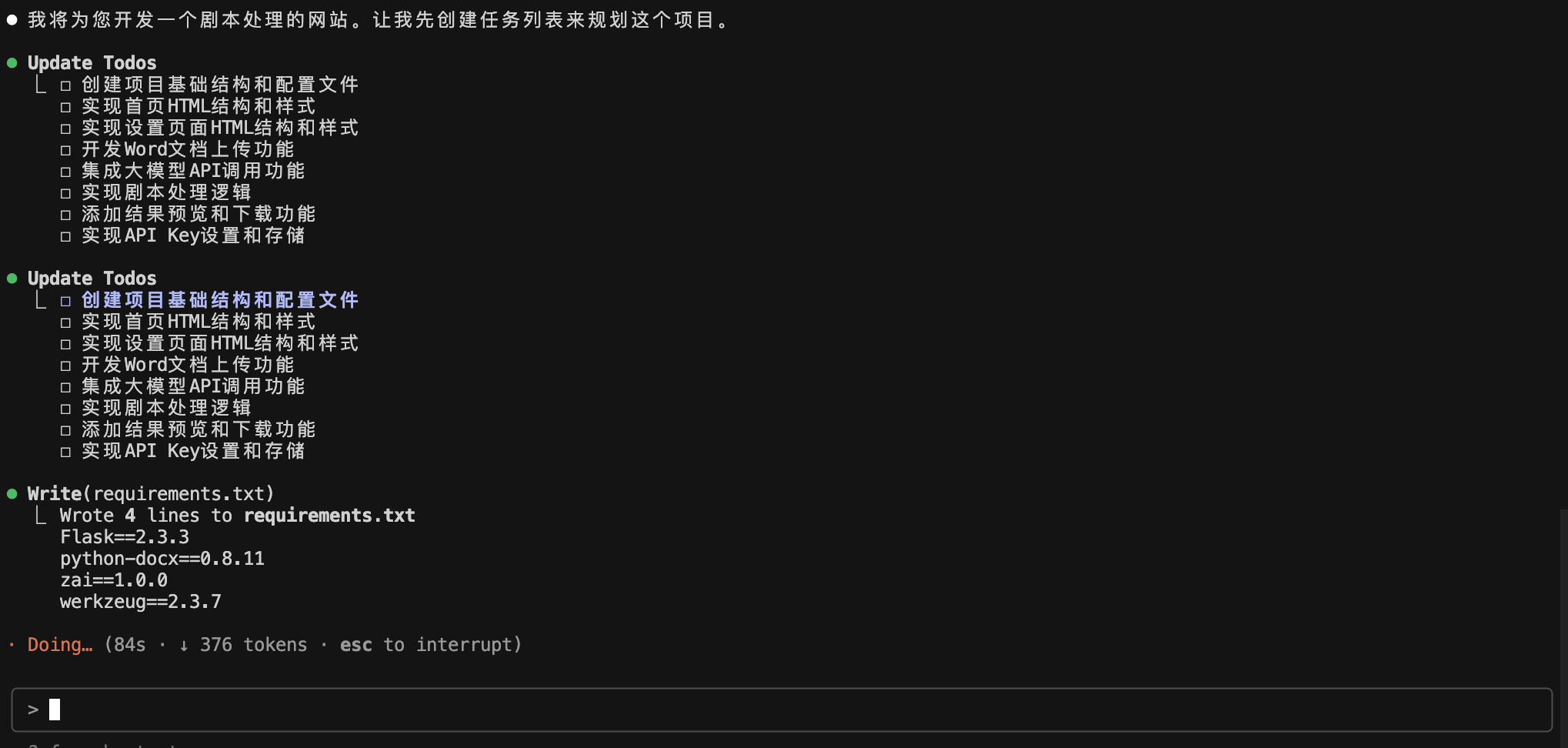 输入提示词,这里我想再次试下创建剧本处理的网站。
