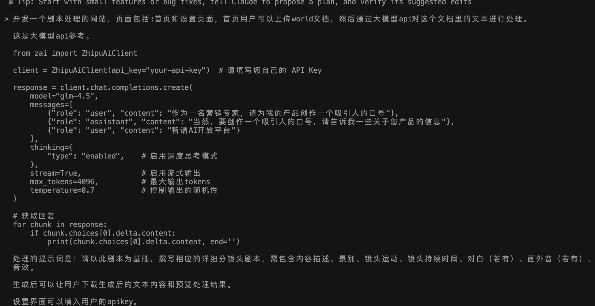 这里我使用智谱的API接入文档中的代码片段。并结合我的需求整理了一段提示词: