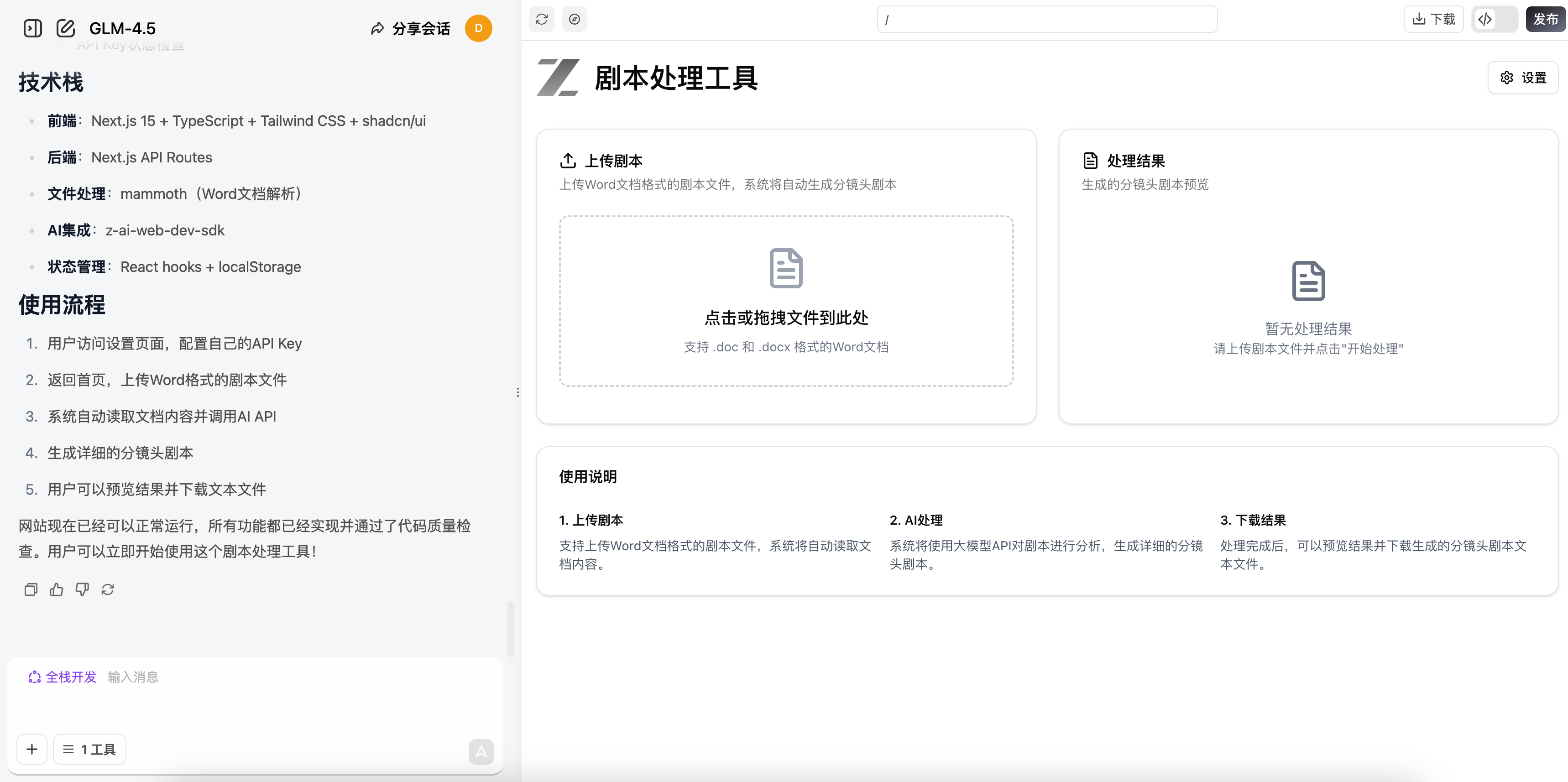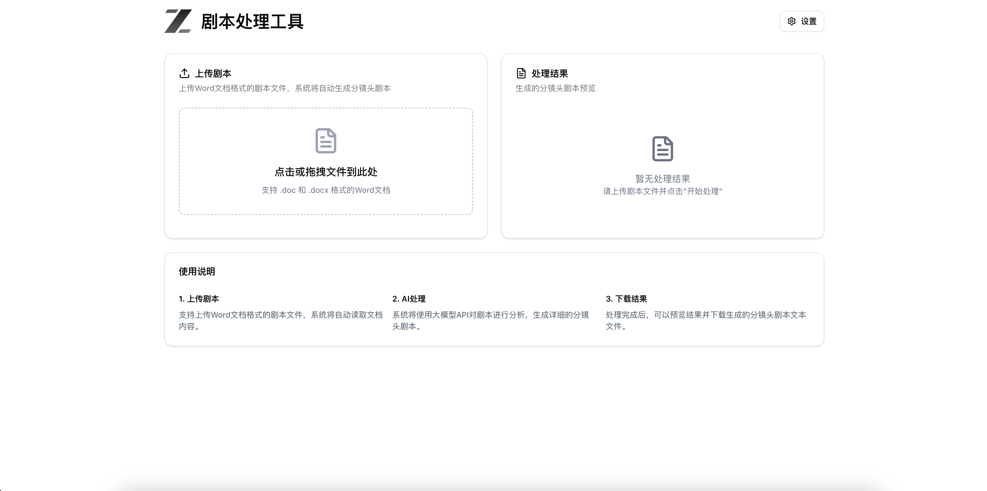 开发一个剧本处理的网站,页面包括:首页和设置页面,首页用户可以上传world文档,然后通过大模型api对这个文档里的文本进行处理。