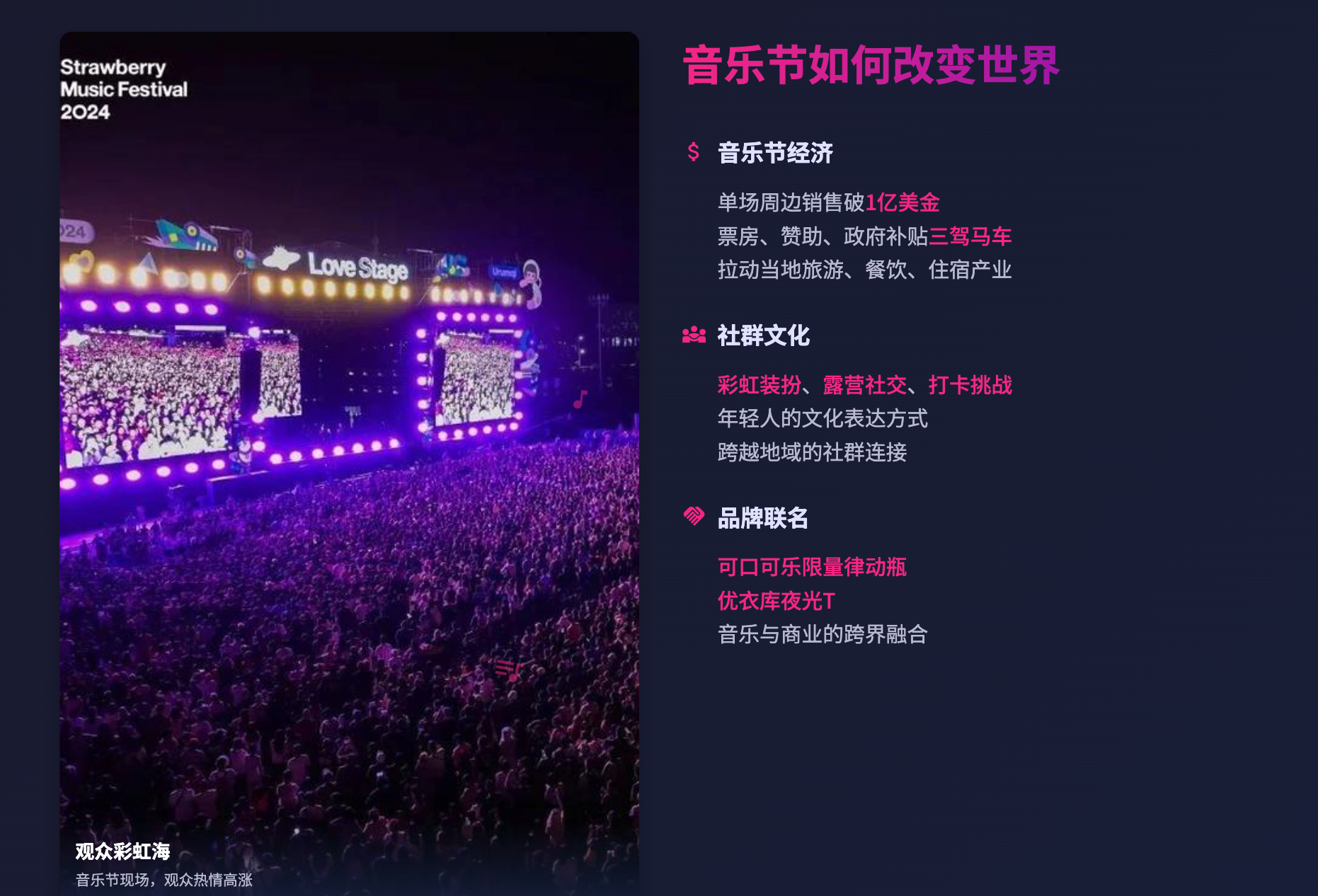 * **配图**:观众彩虹海、联名潮品、露营夜拍