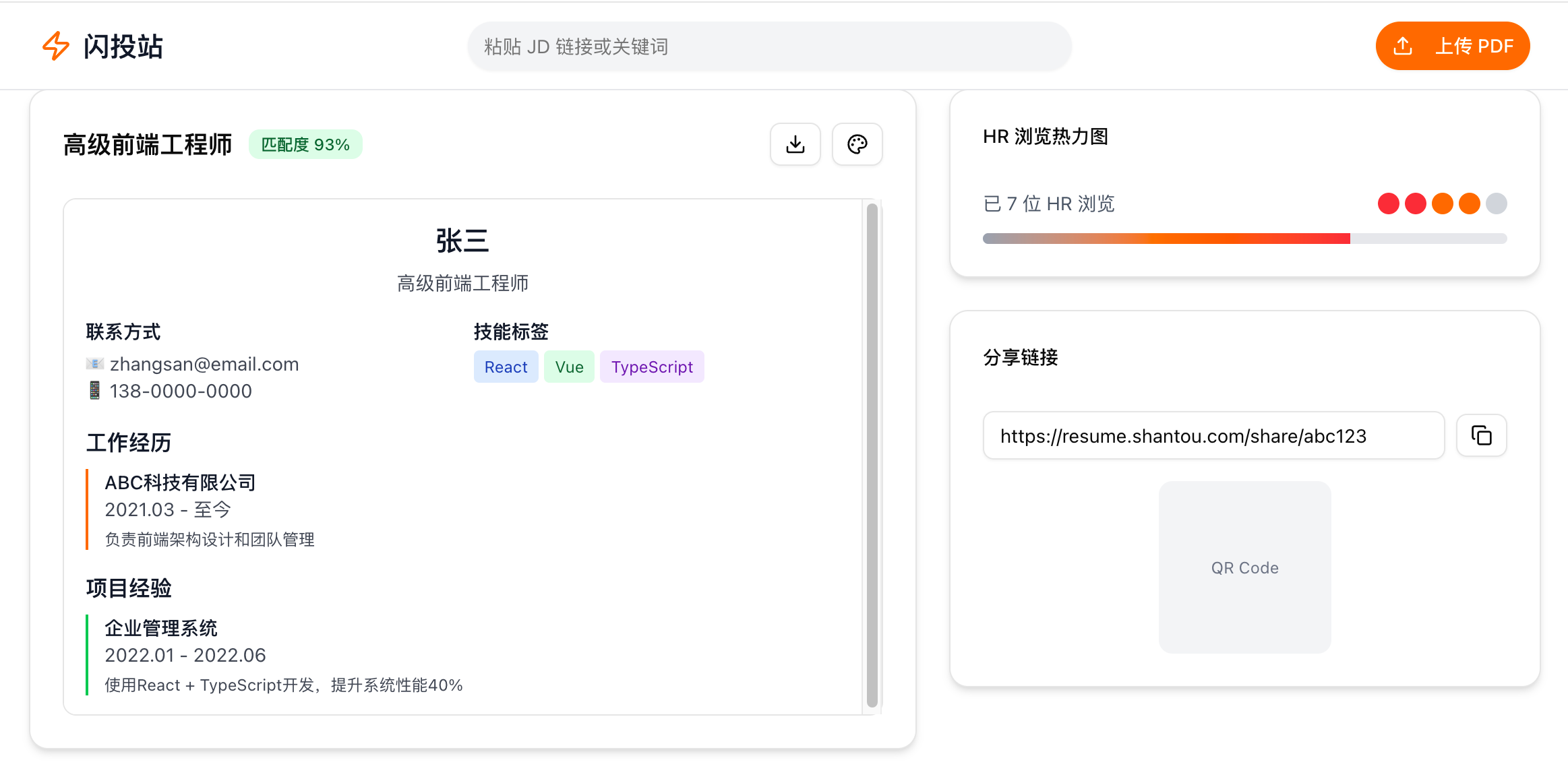 角色:你是资深前端 + 产品设计师,用 React + Tailwind CSS 构建单页 Demo,界面需同时满足「求职者上传端」与「HR 查看端」的双重视角。