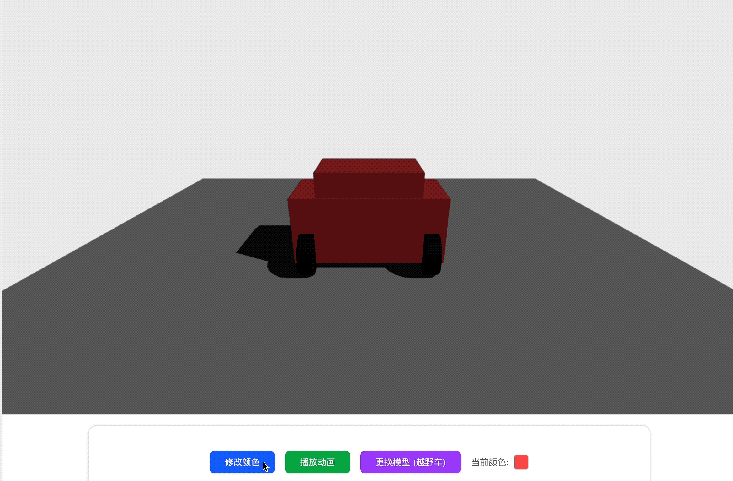 没有现成的汽车模型,GLM-4.5使用立方体和圆组装了一个"汽车",下方还有"修改颜色"、"播放动画"、"更换模型"三个功能。