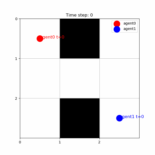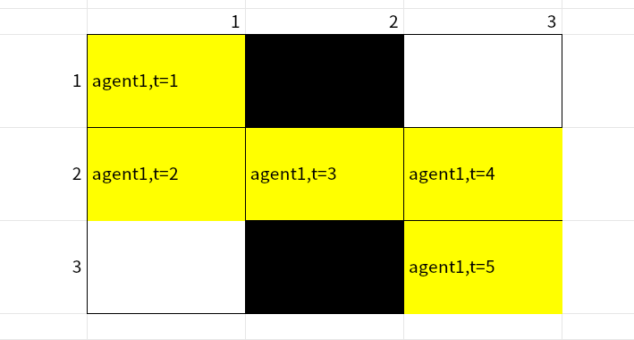 如下图,如果这个地图中有agent1, agent2,其中agent1的优先级高于agent2,那么比如在t4时刻,agent2就不可以到达(2,3)这个位置。