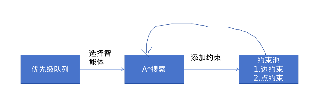 高优先级的路径搜索出之后,每条路径就会产生点约束和边约束,低优先级在满足点约束和边约束的情况下进行A*搜索,搜索出一条路径。