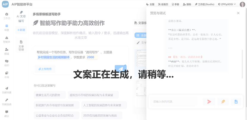 在短视频创作竞争激烈的当下,AIP智能体平台就像创作者背后的“隐形战友”,解决脚本创作的痛点,让创意轻松落地,让高效成为常态。无论你是想靠短视频创业的野心家,还是单纯记录生活的爱好者,它都能成为你创作路上的得力助手,一起解锁短视频创意的新玩法,让每一个脑洞都能变成刷屏的爆款脚本,在短视频的江湖里,闯出属于自己的一片天!