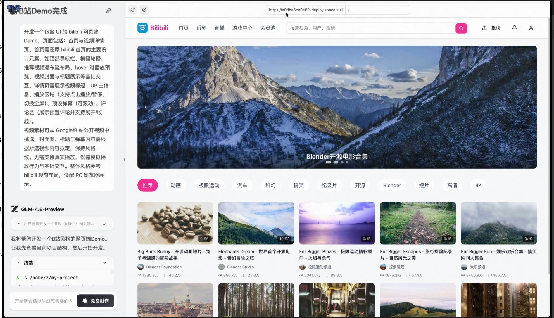 - Web 应用生成: 开发者仅需输入一句指令,如 “做一个跟B站高度相似的视频网站,可以播放视频、发弹幕”,模型即可生成一个功能完善、可交互的前端界面。
