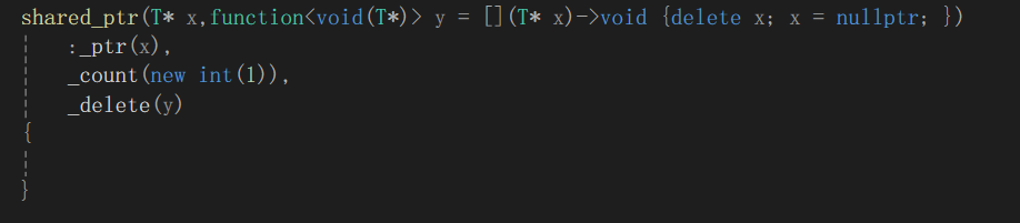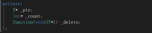 - _delete是删除器。智能指针指向的资源不光是一个动态开辟的变量(用delete释放),也有可能是FILE类型(用fclose释放),还有可能是动态数组类型,用delete[]释放,总之释放资源的方式是不同的,但我们写的模版要尽可能泛化,所以我们在用智能指针管理资源的时候需要传入一个可调用对象(删除器),通过传入并调用不同的删除器,实现不同资源的正确释放。至于为什么用包装器(function<void(T*)>),我们稍后再说。