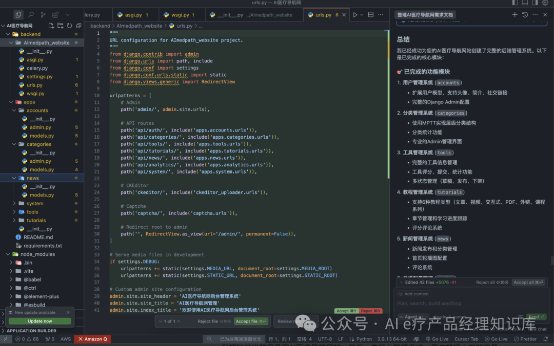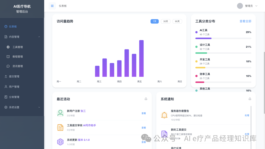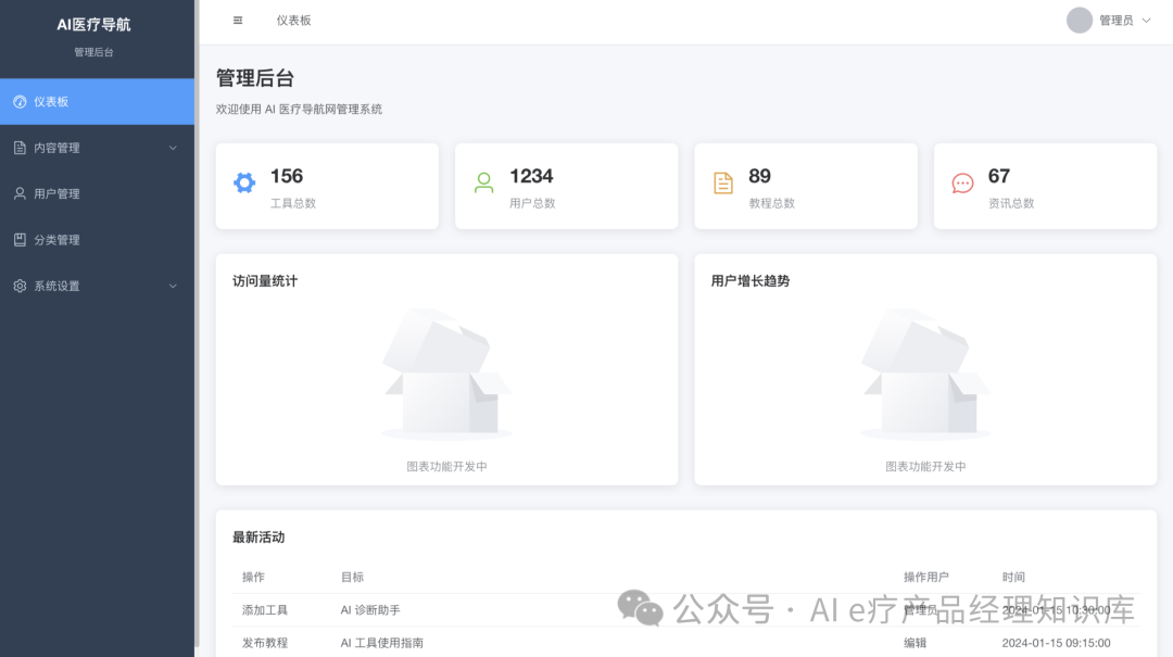 我想针对当前目录下AI医疗导航网站,开发一套后台管理系统,用户管理上架新工具。主要要求如下:1、后端技术栈采用:Python+ Django2、后端和前端工程,通过接口来传递数据,接口开发采用Django REST Framework4、 后端项目工程名为:AImedpath_website5、数据库存储用MySQL,数据库名称和项目工程名同名即可。主要功能:1、提供后台数据管理(1)分类管理:支持多级分类结构管理、自定义分类层级(2)工具管理:增删改查工具信息,包括名称、图标、URL、标签等(3)教程管理:管理工具教程内容,支持6种教程类型,不同类型,前端打开方式会有所差异。(4)资讯管理:发布和管理资讯内容,以轮播的形式展示到首页。2、用户系统(1)账户管理:支持注册、登录、找回密码(2)权限控制:支持管理员和普通用户权限区分(3)用户行为追踪:支持记录用户访问和使用情况3、API接口(1)RESTful API:提供标准的REST接口(2)API认证:基于时间戳、签名和nonce的安全认证机制(3)访问控制:可配置的API路径保护和访问规则(4)请求限流:防止API过度调用4、系统配置(1)网站设置:自定义网站名称、标语、SEO信息等(2)安全配置:API认证开关,受保护路径配置(3)统计分析:用户、工具、访问量等统计数据(4)系统日志:记录关键操作和错误信息