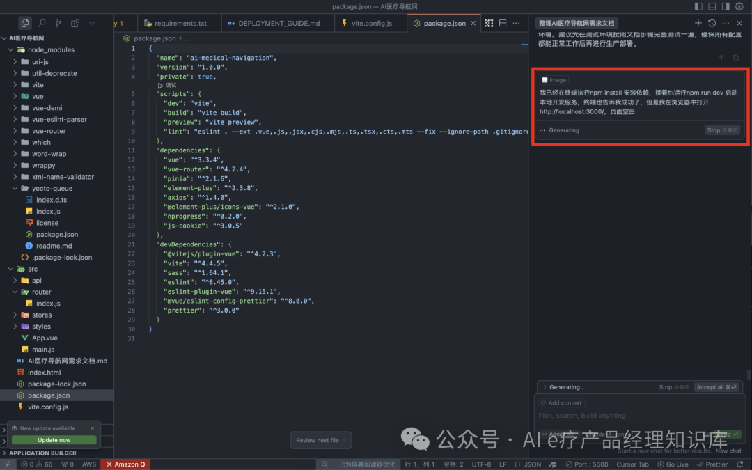 打开终端后,先通过 cd 命令进入项目根目录(就是有 package.json 的那个文件夹 )。比如我的项目在 Desktop/AI医疗导航网 里,就执行: