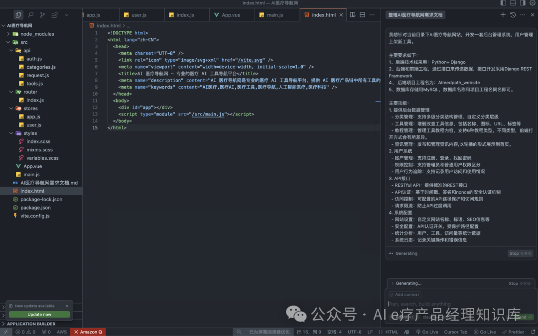 点击发送后,Cursor将自动生成项目结构及各文件代码。
