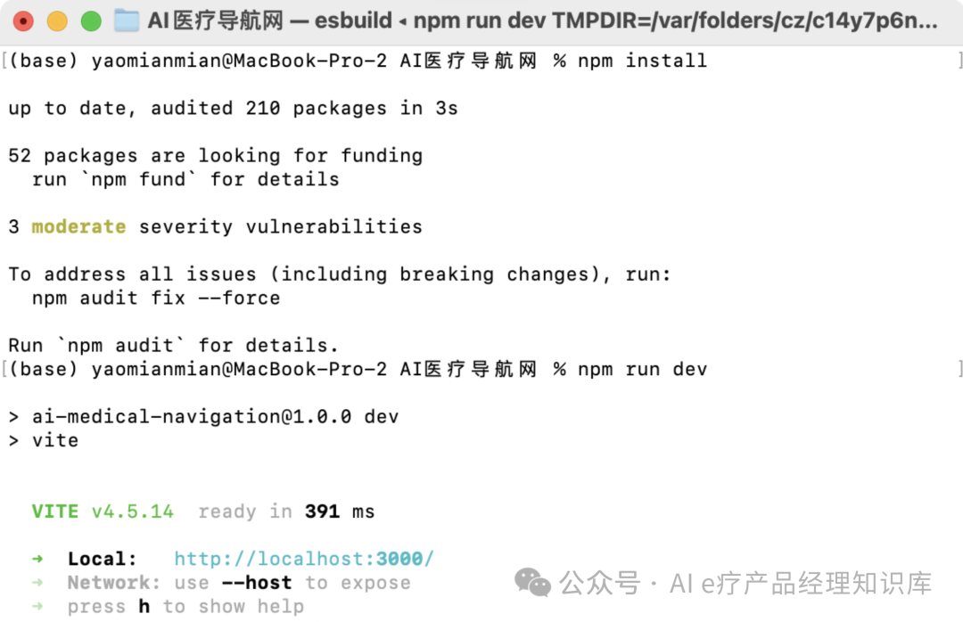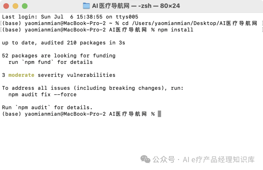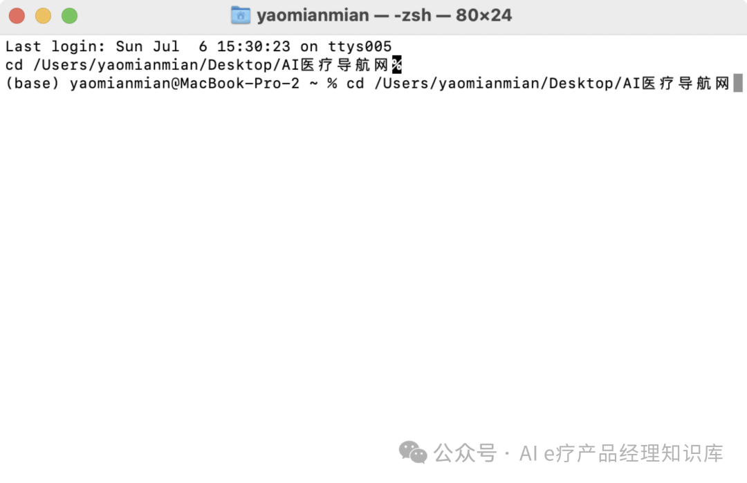 执行完,终端提示符会变成类似 (base) yaomianmian@MacBook-Pro-2 AI医疗导航网 % ,说明成功进入项目目录了。