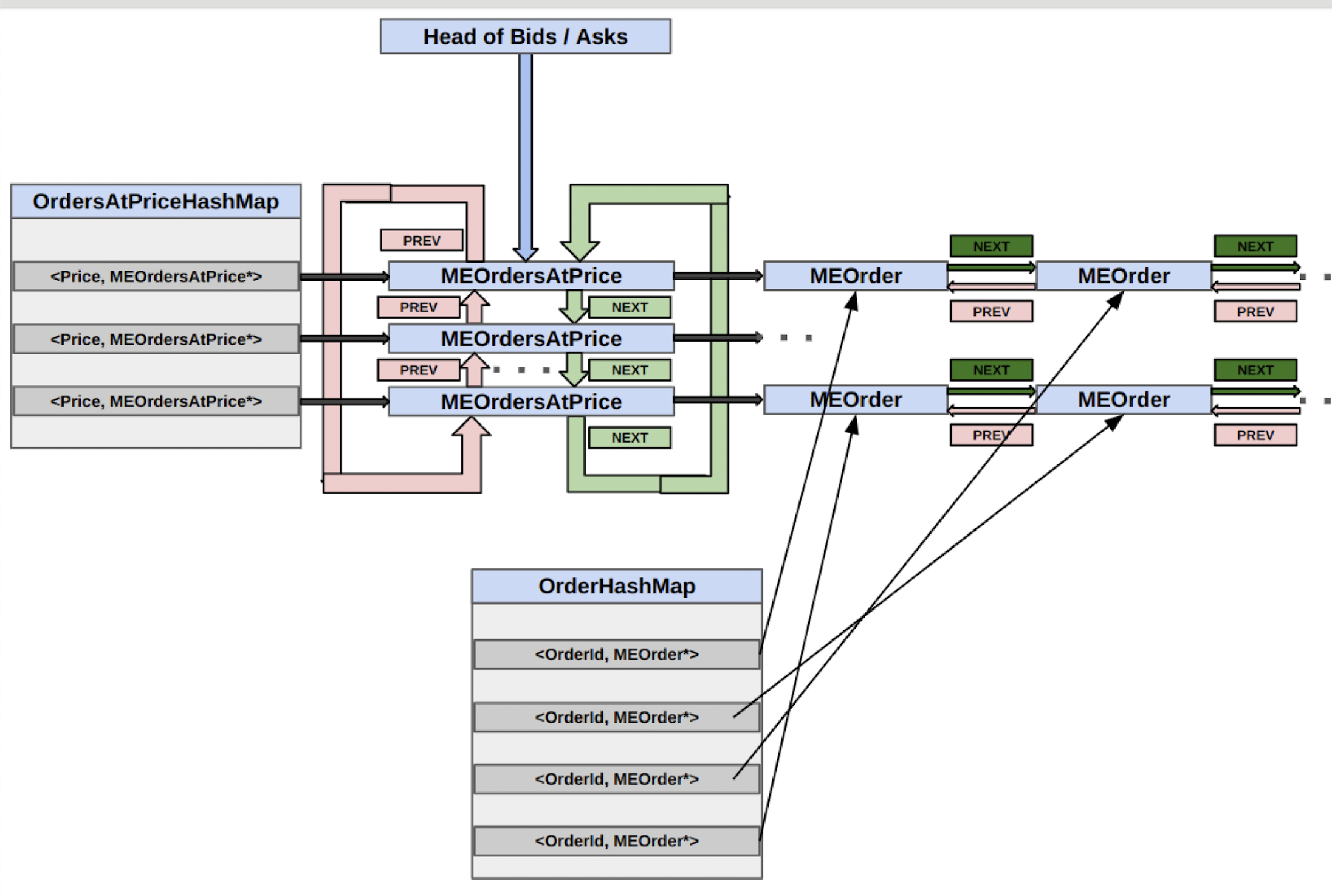 首先,我们阐述了在撮合引擎和限价订单簿方面的一些假设。我们还定义了一些基本的普通旧数据(POD,Plain Old Data)风格的结构体,用于封装限价订单簿中单个订单、订单服务器发送的单个订单请求、发回给订单服务器的订单响应,以及单个市场数据更新的信息。我们展示了如何使用无锁队列(lock-free queue)来促进撮合引擎与订单服务器和市场数据发布者之间关于订单请求、订单响应和市场数据更新的通信。为了构建限价订单簿,我们还定义了一些哈希表(hash maps),以便通过订单ID跟踪订单,并在MEOrdersAtPrice结构中将相同价格的订单链接在一起。再次强调,这些价格水平本身是通过双向链表(doubly linked list)和按价格索引的哈希表来维护的。