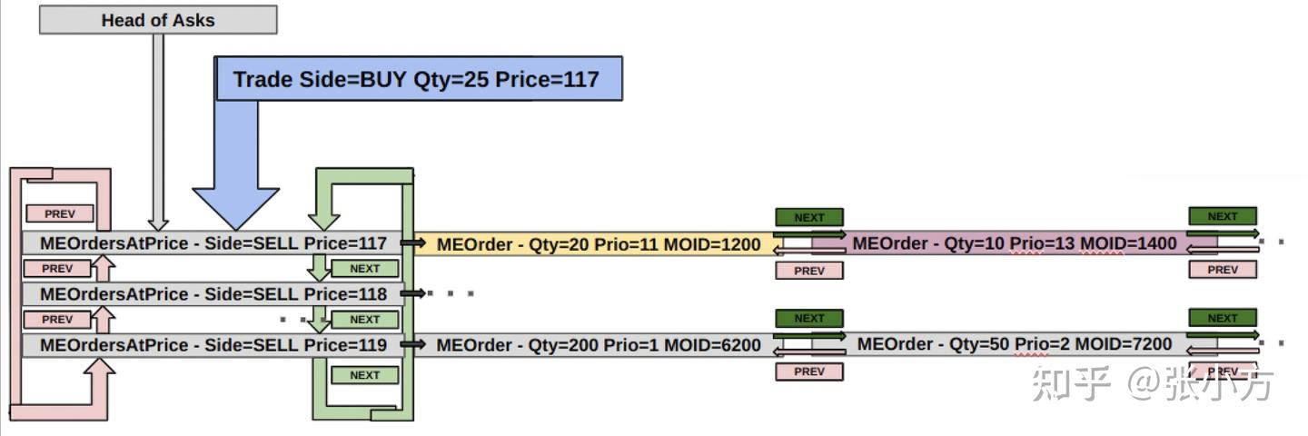 在本小节中,我们将通过展示之前提到的MEOrderBook::checkForMatch()方法,来实现限价订单簿中的撮合功能。图6.3展示了在限价订单簿的一个假设状态下会发生什么。这里展示了卖盘的状态,由MEOrdersAtPrice表示的被动卖盘价格依次为117、118、119等。在最佳卖盘价格117处,显示了前两个MEOrder对象,第一个的优先级为11,市场订单ID为1200,数量为20。在先进先出队列中排在其后的MEOrder优先级为13,市场订单ID为1400,数量为10。在这种情况下,一个数量为25、价格为117的新买单(以蓝色表示)将与市场订单ID为1200的第一个订单(以黄色表示)完全匹配并执行。然后,它将剩余的5个数量部分地与市场订单ID为1400的订单(以品红色表示)执行匹配,撮合事件就此完成。以下图表之后的算法展示了这些步骤。